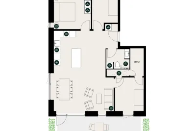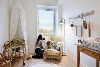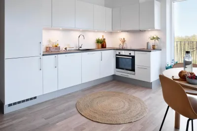 Her flytter du ind i en lys og moderne lejebolig med en gennemtænkt planløsning og livskvalitet i hver en kvadratmeter. Start dagen roligt ud med familiebrunch i det rummelige alrum, nyd udsigten til årstidernes skiften over en kop kaffe fra din egen altan eller lad ungerne udforske det frodige gårdrum.