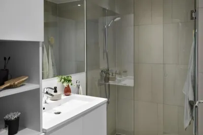 One of the other assets in the apartments is the spacious bathroom, which is created in a timeless minimalistic design. This bathroom offers a beautiful shower, cabinet space, washing machine and dryer from Siemens and a wall-hung toilet.