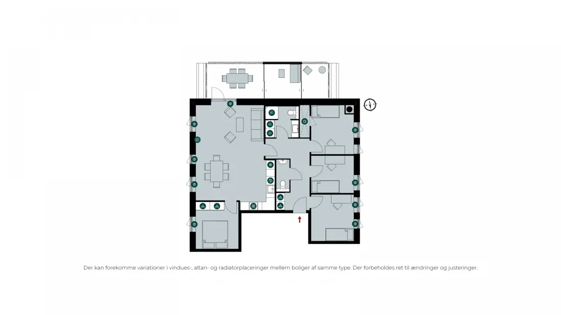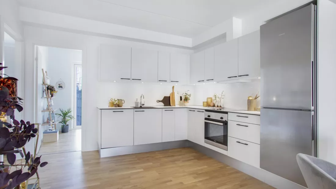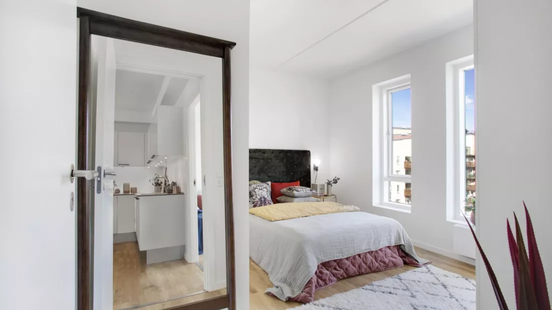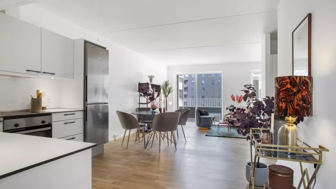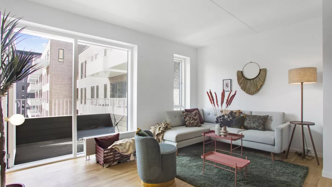 The heart of the apartment is a large living room which is combined with the kitchen to create a spacious atmosphere. The large window sections draw daylight into the apartment from all angles. The apartment is also equipped with a modern kitchen from Invita, appliances from Bosch Siemens and plenty of wardrobe space in the master bedroom. From the entry hall, you have access to the spacious and inviting bathroom with built-in underfloor heating, a moulded marble sink, a wall-hung toilet and a combined washer and dryer. From the living room, you have access to a large balcony that provides a private breathing space with plenty of sunlight, fresh air and relaxation. You can apply for pet permission in all our apartments. NOTE: if you want measurements of the apartment, you must bring the measuring equipment to the showing yourself, as there are no measurements on the floor plan.