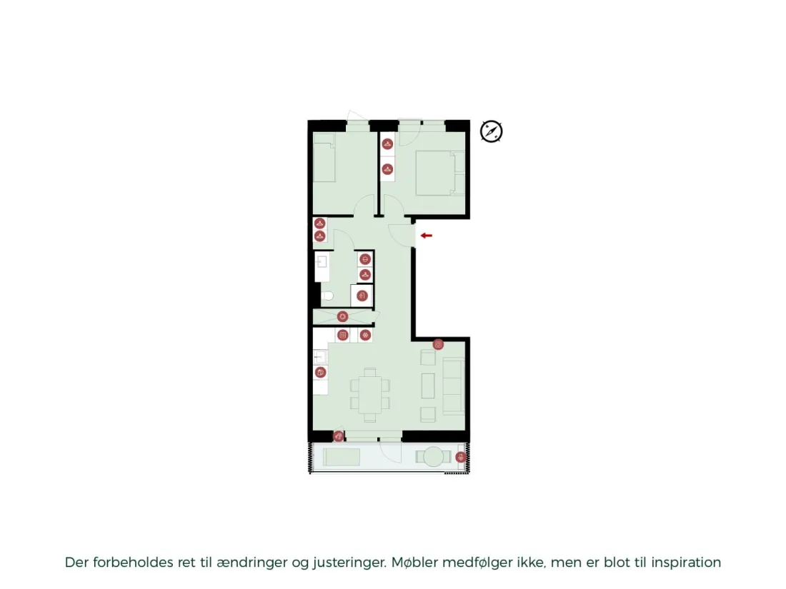 Well-designed 2-bedroom flat with two spacious bedrooms facing the courtyard, and built-in cupboards in one of them. You enter the flat through a spacious entrance hall, which also offers cupboard space and access to all rooms in the flat. Bathroom in a timeless, minimalist design with a tiled floor and shower stall, underfloor heating and a wash-basin. Kitchen-dining area featuring a modern white Invita kitchen, including all necessary domestic appliances. The flat has access to a balcony from the living room.