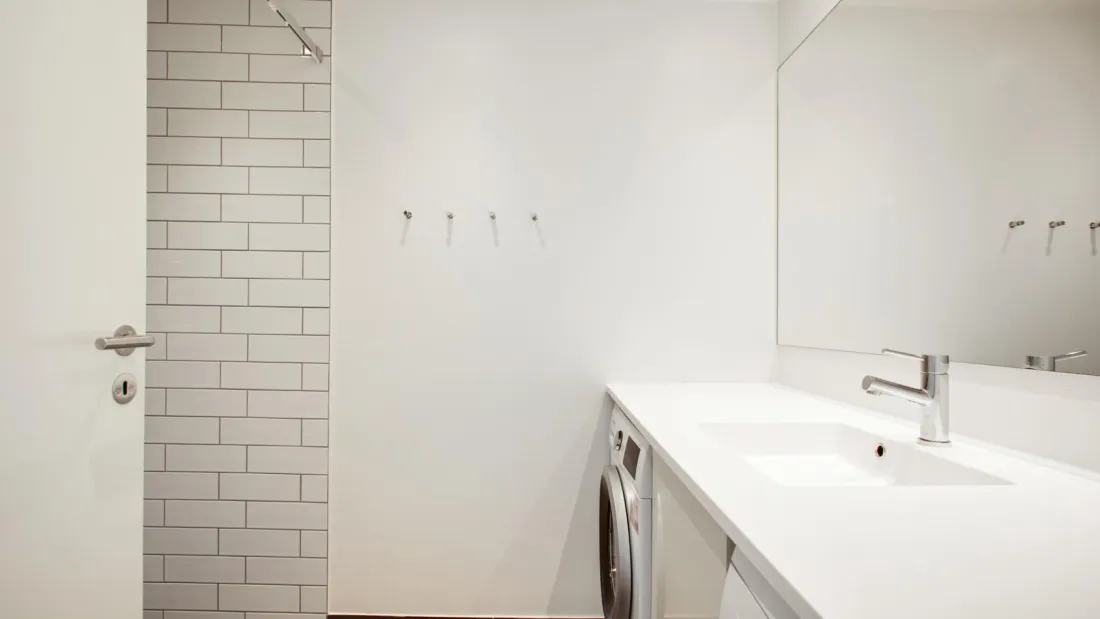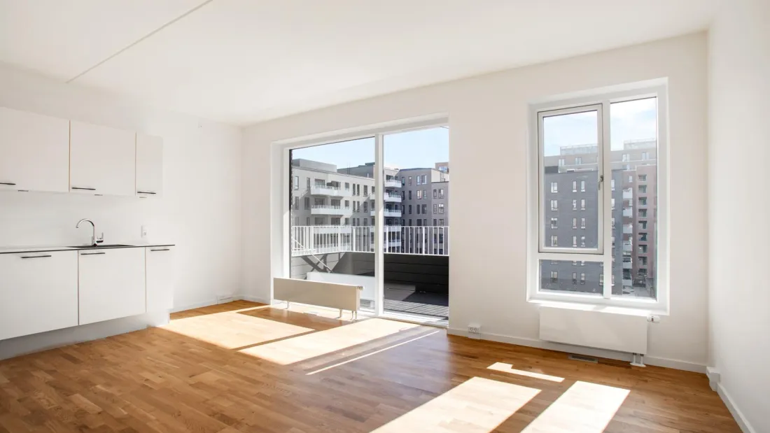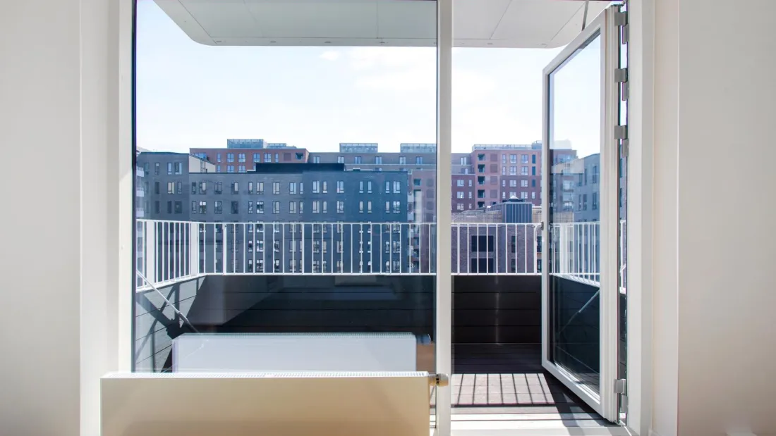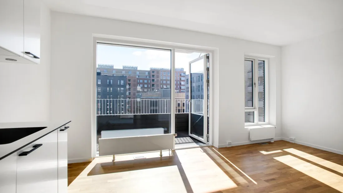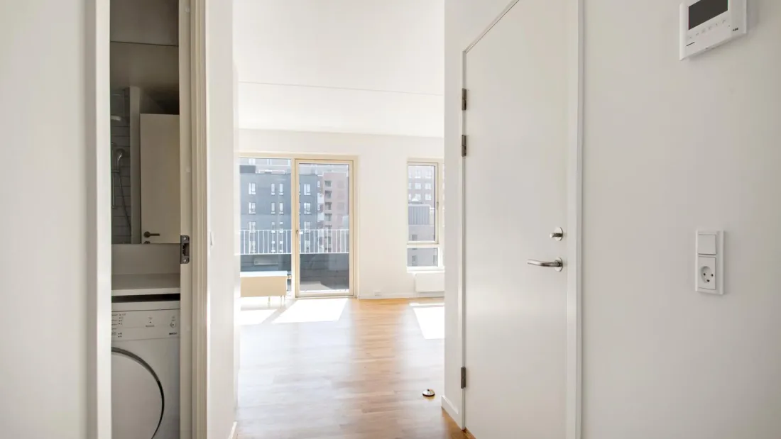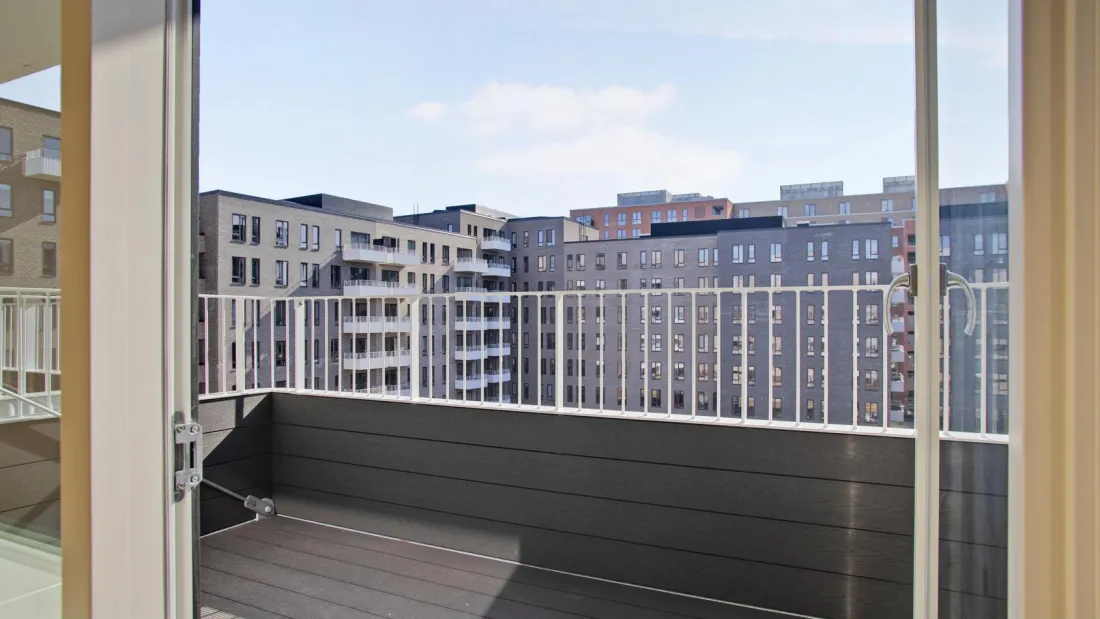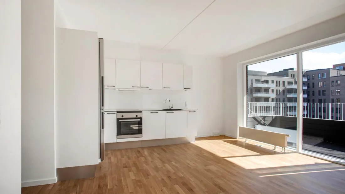 The heart of the apartment is a large living room which is combined with the kitchen to create a spacious atmosphere. The large window sections draw daylight into the apartment from all angles. The apartment is also equipped with a modern kitchen from Invita, appliances from Bosch Siemens and plenty of wardrobe space in the master bedroom. From the entry hall, you have access to the spacious and inviting bathroom with built-in underfloor heating, a moulded marble sink, a wall-hung toilet and a combined washer and dryer. From the living room, you have access to a large balcony that provides a private breathing space with plenty of sunlight, fresh air and relaxation. You can apply for pet permission in all our apartments. NOTE: if you want measurements of the apartment, you must bring the measuring equipment to the showing yourself, as there are no measurements on the floor plan.
