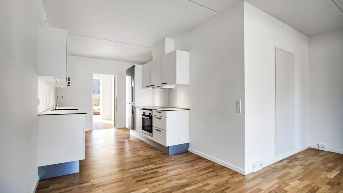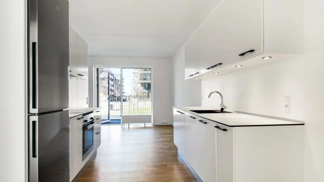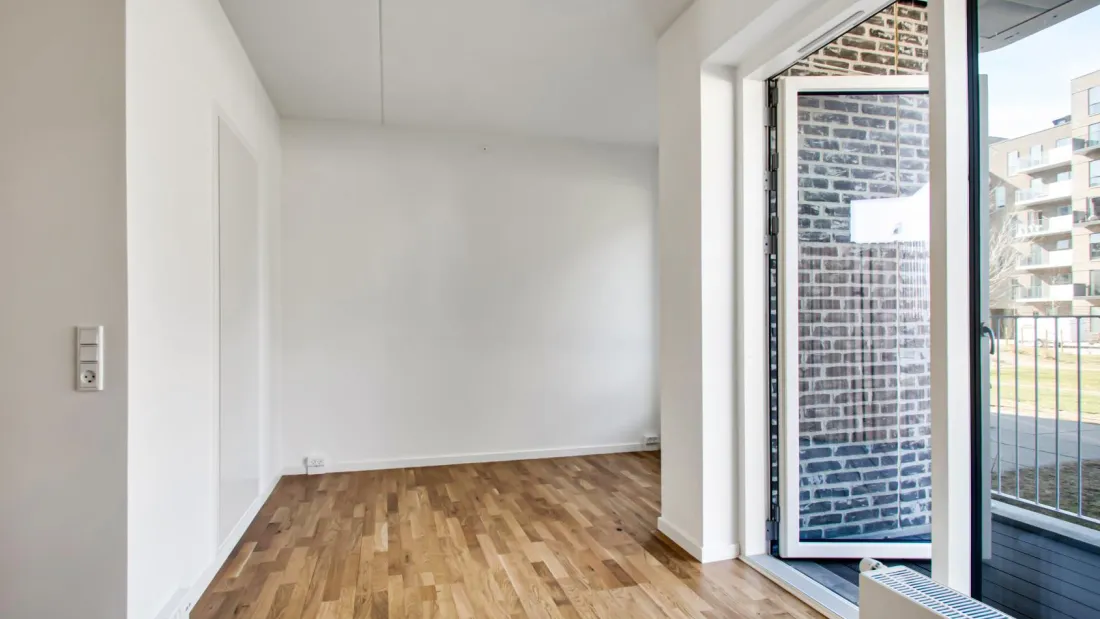 The heart of the apartment is a large living room which is combined with the kitchen to create a spacious atmosphere. The large window sections draw daylight into the apartment from all angles. The apartment is also equipped with a modern kitchen from Invita, appliances from Bosch Siemens and plenty of wardrobe space in the master bedroom. From the entry hall, you have access to the spacious and inviting bathroom with built-in underfloor heating, a moulded marble sink, a wall-hung toilet and a combined washer and dryer. From the living room, you have access to a large balcony that provides a private breathing space with plenty of sunlight, fresh air and relaxation. You can apply for pet permission in all our apartments. NOTE: if you want measurements of the apartment, you must bring the measuring equipment to the showing yourself, as there are no measurements on the floor plan.