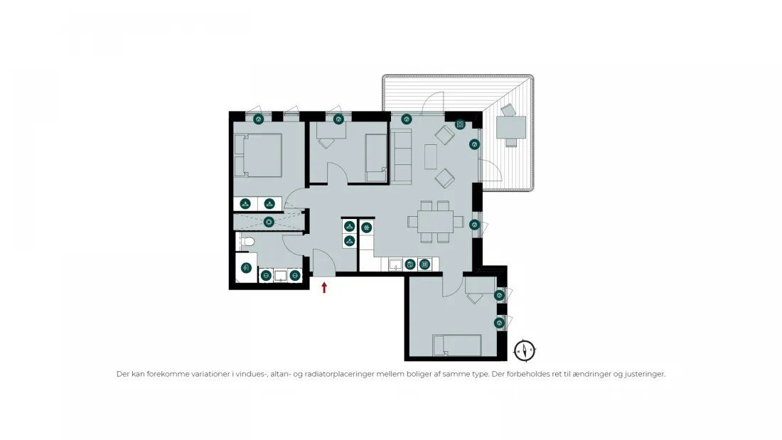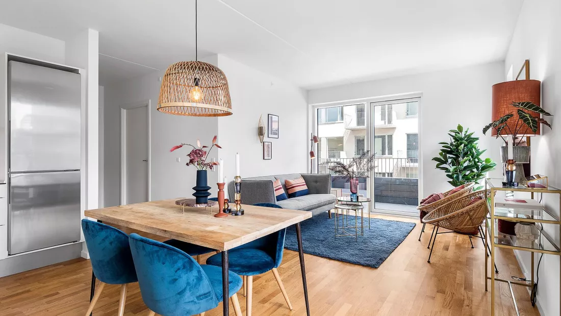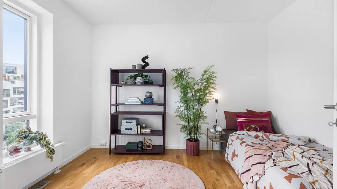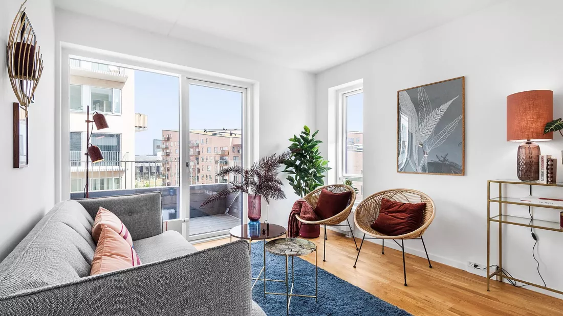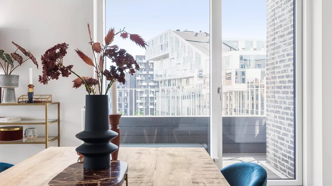 The heart of the apartment is a large living room which is combined with the kitchen to create a spacious atmosphere. The large window sections draw daylight into the apartment from all angles. The apartment is also equipped with a modern kitchen from Invita, appliances from Bosch Siemens and plenty of wardrobe space in the master bedroom. From the entry hall, you have access to the spacious and inviting bathroom with built-in underfloor heating, a moulded marble sink, a wall-hung toilet and a combined washer and dryer. From the living room, you have access to a large balcony that provides a private breathing space with plenty of sunlight, fresh air and relaxation. You can apply for pet permission in all our apartments. NOTE: if you want measurements of the apartment, you must bring the measuring equipment to the showing yourself, as there are no measurements on the floor plan.
