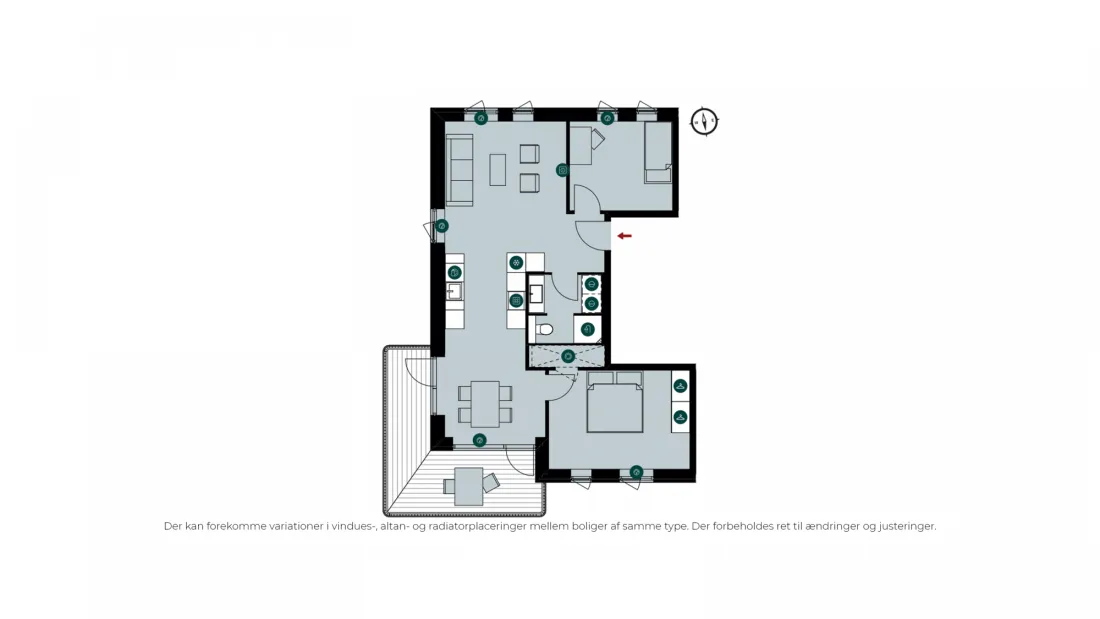 The heart of the apartment is a large living room which is combined with the kitchen to create a spacious atmosphere. The large window sections draw daylight into the apartment from all angles. The apartment is also equipped with a modern kitchen from Invita, appliances from Bosch Siemens and plenty of wardrobe space in the master bedroom. From the entry hall, you have access to the spacious and inviting bathroom with built-in underfloor heating, a moulded marble sink, a wall-hung toilet and a combined washer and dryer. From the living room, you have access to a large balcony that provides a private breathing space with plenty of sunlight, fresh air and relaxation. You can apply for pet permission in all our apartments. NOTE: if you want measurements of the apartment, you must bring the measuring equipment to the showing yourself, as there are no measurements on the floor plan.