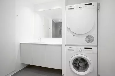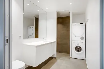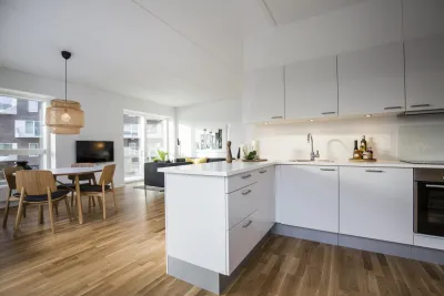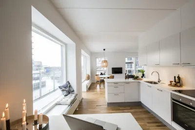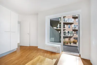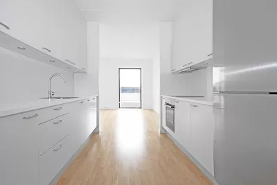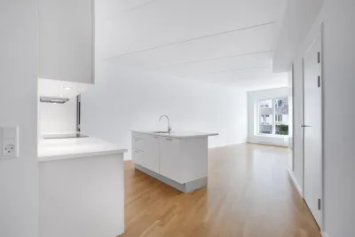 At Skibbroen you get to move into a modern and timeless apartment, built in light materials, with large windows. Most of the homes at Skibbroen have a direct view towards the water and harbour. Furthermore you get a large, bright kitchen from Invita, with plenty of closet space and high-quality major appliances from Siemens. The kitchen has an open connection to a spacious living room, with the option to create and furnish an eating area, as well as a cosy sofa corner. All the apartments are equipped with a nice, white bathroom, which is built with large tiles on the floor, as well as in the shower. The bathroom also includes a separate washing column with a washing machine, a drying machine and underfloor heating. All the floors in the apartment consist of oak parquet from Junckers.