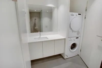 Badeværelserne er udstyret med store, tidløse fliser, og tilbyder en separat vaskesøjle med både vaskemaskine og tørretumbler. Gulvvarmen bidrager med en ekstra dimension af komfort og luksus, som du vil værdsætte hver eneste dag.