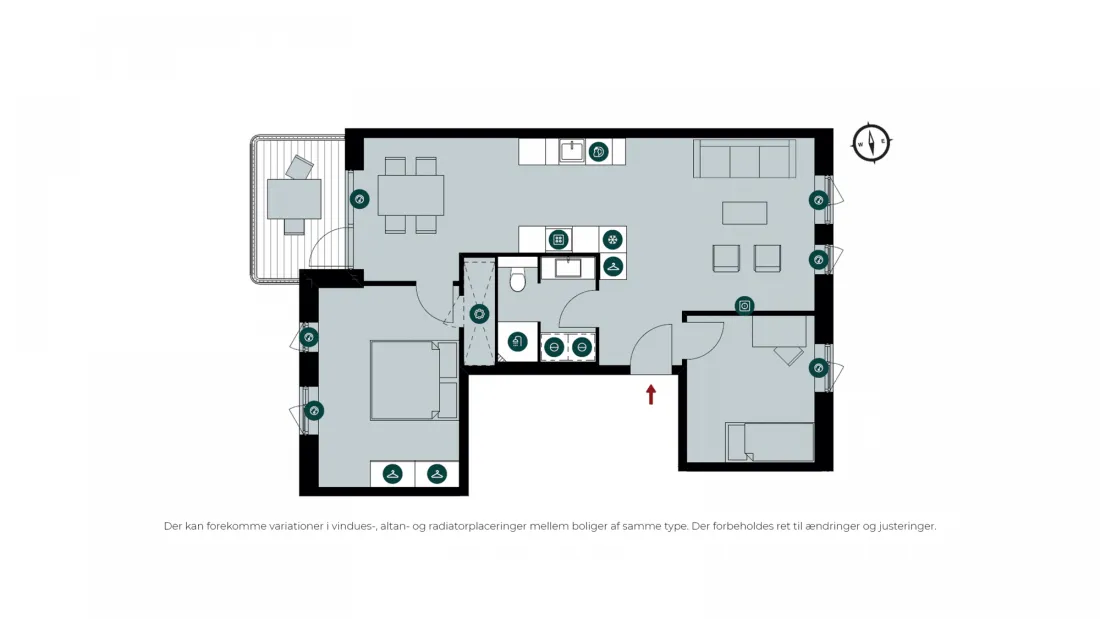 Lejligheden er indrettet med et stort alrum, hvor køkken og stue smelter sammen og skaber en rummelig atmosfære. De store vinduespartier trækker lys ind i lejligheden fra alle vinkler. Dertil er boligen udstyret med et moderne køkken fra Invita, hårde hvidevarer fra Bosch Siemens samt praktisk skabsplads i mastersoveværelset. Fra gangen har du adgang til det rummelige og indbydende badeværelse med gulvvarme, formstøbt marmorvask, væghængt toilet samt vaskesøjle. Fra stuen har du udgang til en stor møblérbar altan, der giver et privat pusterum med masser af sol, frisk luft og hygge. Det er muligt at ansøge om husdyrtilladelse i alle vores lejemål. OBS: ønskes der mål af lejligheden skal du selv huske opmålings udstyr til fremvisning, da der ikke er mål på plantegningen.