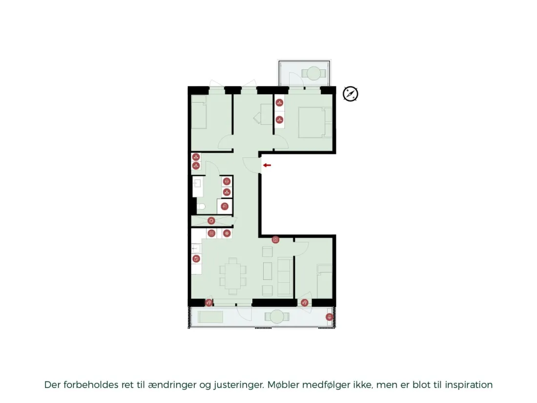 Du kommer ind i lejligheden gennem en rummelig entré med skabsplads og med adgang til alle lejlighedens rum. Der er mellem de to af boligens soveværelser mod gården skabt et multirum, som kan udnyttes til blandt andet hjemmekontor, legeområde eller hobbyrum. Derudover byder lejligheden på køkken/alrum med moderne hvidt Invita køkken med alt i hårde hvidevarer, endnu et soveværelse samt badeværelse i tidløst minimalistisk design med fliser på gulv og i brusenichen, gulvvarme og vaskesøjle. Lejligheden har udgang til altaner både fra stuen og fra soveværelset.
