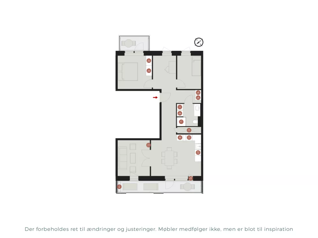 Du kommer ind i lejligheden gennem en rummelig entré med skabsplads og med adgang til alle lejlighedens rum. Der er mellem de to af boligens soveværelser mod gården skabt et multirum, som kan udnyttes til blandt andet hjemmekontor, legeområde eller hobbyrum. Derudover byder lejligheden på køkken/alrum med moderne hvidt Invita køkken med alt i hårde hvidevarer, med adgang til dagligstuen som er opdelt fra køkkenet med franske døre, samt badeværelse i tidløst minimalistisk design med fliser på gulv og i brusenichen, gulvvarme og vaskesøjle. Lejligheden har udgang til altaner både fra stuen og fra soveværelset.