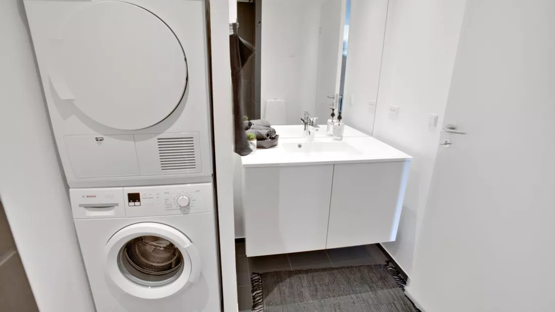 Lejligheden fremstår lys og rummelig med åbent køkken og dagligstue i samme centrale rum. Det hvide køkken, med integrerede greb, er fra Invita og indeholder desuden hårde hvidevarer fra Bosch. På badeværelset er der vaskesøjle med vaskemaskine og tørretumbler, også fra Bosch. Boligen er orienteret således at man får mest muligt lysindfald, hvilket skaber et flot spil på det lyse gulv i ask. Det er muligt at ansøge om husdyrtilladelse i alle vores lejemål. OBS: ønskes der mål af lejligheden skal du selv huske opmålings udstyr til fremvisning, da der ikke er mål på plantegningen.