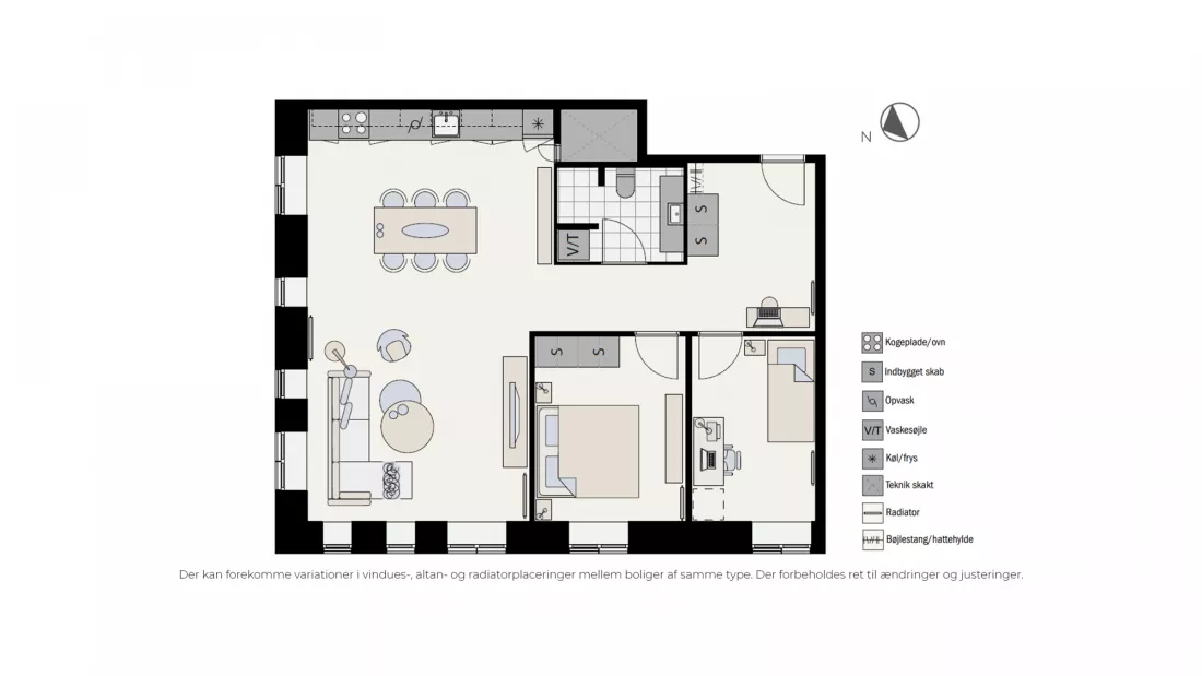 Lejligheden fremstår lys og rummelig med åbent køkken og dagligstue i samme centrale rum. Det hvide køkken, med integrerede greb, er fra Invita og indeholder desuden hårde hvidevarer fra Bosch. På badeværelset er der vaskesøjle med vaskemaskine og tørretumbler, også fra Bosch. Boligen er orienteret således at man får mest muligt lysindfald, hvilket skaber et flot spil på det lyse gulv i ask. Det er muligt at ansøge om husdyrtilladelse i alle vores lejemål. OBS: ønskes der mål af lejligheden skal du selv huske opmålings udstyr til fremvisning, da der ikke er mål på plantegningen.