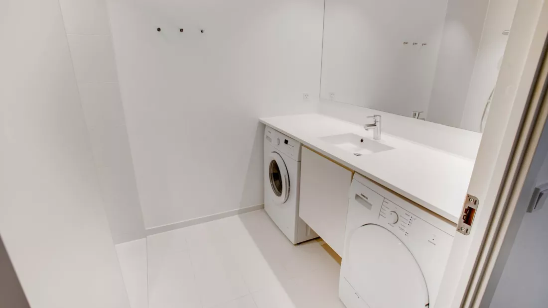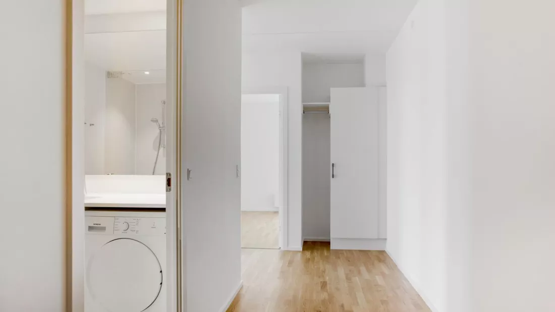 Lejligheden er opført i skandinavisk stil, der får den til at fremstå moderne, lys og indbydende. De store vinduer lukker store mængder dagslys ind og skaber derved en varm atmosfære og et flot spil på det lyse egetræsgulv. Lejlighedens hjerte er et centralt opholdsrum med åbent køkken og spiseplads. Det diskrete, hvide køkken er fra Invita med hårde hvidevarer fra Siemens. På badeværelset er der fliser på gulvet og i brusekabinen. Der er desuden vaskemaskine og tørretumbler fra Siemens. I mastersoveværelset findes indbyggede skabe til opbevaring. Det er muligt at ansøge om husdyrtilladelse i alle vores lejemål. OBS: ønskes der mål af lejligheden skal du selv huske opmålings udstyr til fremvisning, da der ikke er mål på plantegningen.