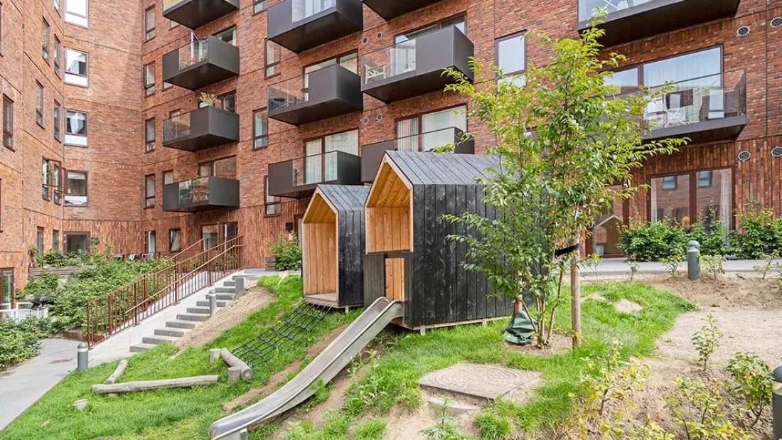 Carlsbakken er tegnet af de prisvindende arkitekter Holscher Nordberg, der har skabt en moderne bygning med tre afrundede hjørner og varierende højder. Denne særlige designfeature - de runde, bløde hjørner – giver ejendommen et helt unikt og organisk udtryk. Bygningens forskellige højder skaber dynamiske facader, og sikrer også at der opnås størst muligt lysindfald i lejligheder og gårdarealer - samt en “solsikker” fælles tagterrasse. Den røde tegl har en stærk historisk reference til Hillerød og byens ikoniske bygninger. I Carlsbakken får du en bolig der reducerer miljøpåvirkningen ved at være en lavenergibyggeri. Tagfladen forsynes derudover med sedumbelægning, der foruden at være smukt også har til hensigt, at absorbere og forsinke store mængder regnvand. Ejendommens navn ”Carlsbakken” er opkaldt efter det skrånende terræn, der giver et spændende og varieret gårdrum, og danner en naturlig zoneinddeling med plads til både leg og ophold. Desuden giver det mulighed for cykelparkering i ejendommens grundniveau - uden trapper - så du nemt kan parkere din cykel eller ladcyklel i aflåst tørvejr.