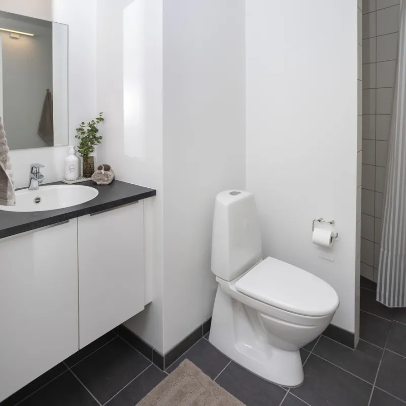 Det skønne og rummelige badeværelse er det perfekte sted at starte dagen roligt ud. Her har du selvfølgelig separat bruseniche og vaskesøjle. De fleste lejligheder har desuden egen altan eller terrasse, hvor du kan nyde morgenkaffen i ro og mag.
