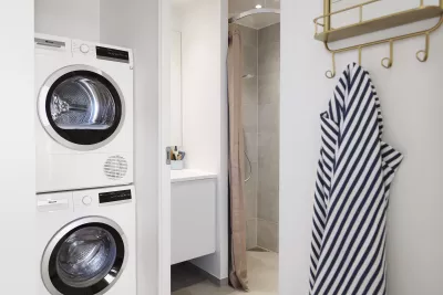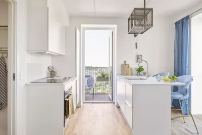Den fornuftige bord- og skabsplads gør det nemt at have et ryddeligt køkken. I flere af lejlighederne giver indretningen mulighed for siddepladser til lektier eller hjemmearbejde – eller bare hyggelig samtale over madlavningen.
